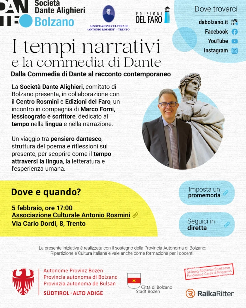 Marco Forni, lessicografo e scrittore, in occasione di questo incontro per far conoscere l’attività della Società Dante Alighieri – Comitato di Bolzano grazie alla presidente Raffaella De Rosa, proporrà un intervento dal titolo: “I tempi narrativi e la Commedia di Dante”. Grazie all'Associazione Culturale Rosmini che ospita l'incontro al quale siete tutti invitati per poter aderire alla Società e ampliare le opportunità di scambio tra persone con interessi nel mondo della parola.