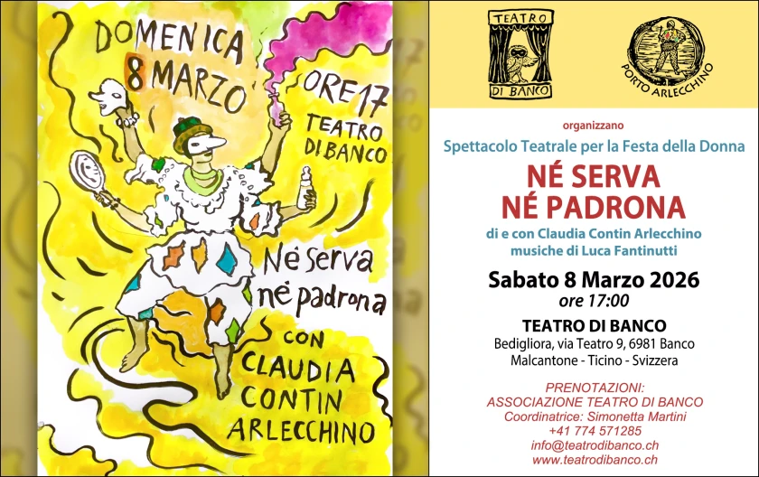 In occasione della Giornata Internazionale della Donna 8 Marzo 2026, Claudia Contin Arlecchino torna al Teatro di Banco, nel cuore del Malcantone svizzero, per festeggiare col suo spettacolo “Né serva né padrona”. Si tratta di un esilarante spettacolo di trasformismo, con continui cambi di costume a vista. La poliedrica attrice Claudia Contin Arlecchino si trasforma sotto gli occhi del pubblico in tutti i personaggi di cui racconta le vite, le storie e gli aneddoti. Un cordiale Arlecchino servitore di due padrone e di tutte le donne del pubblico, si alterna alla frizzante Servetta Polentina, che offre agli spettatori assaggi delle sue bizzarre arti culinarie e casalinghe.